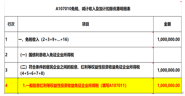 4、由于稅法對符合條件的股息、紅利等權益性投資收益給予免稅待遇,因此只需要填報A107011、A107010申報表來反應投資收益免征企業(yè)所得稅。