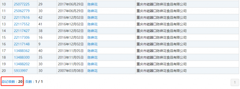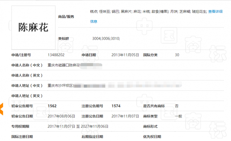 此后,陳麻花公司又在多個類別布局了“陳麻花”、“陳麻花記憶”、“陳麻花磁器口”、“陳麻花陳昌銀”等相關(guān)商標(biāo)。