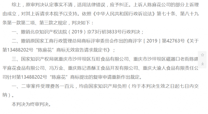 該終審判決書顯示,撤銷一審行政判決和商標(biāo)無效宣告請求裁定書,要求國家知識產(chǎn)權(quán)局針對第13488202號“陳麻花”商標(biāo)提出的復(fù)審申請重新作出裁定。